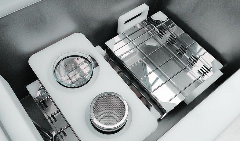 - Des cycles manuels : remplissage en eau claire, ultrasons, vidange et séchage.